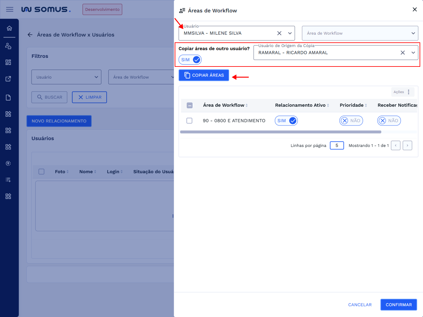 Agora todas as áreas do usuário de origem foram inseridas para o usuário de destino, para continuar clique em “CONFIRMAR”.