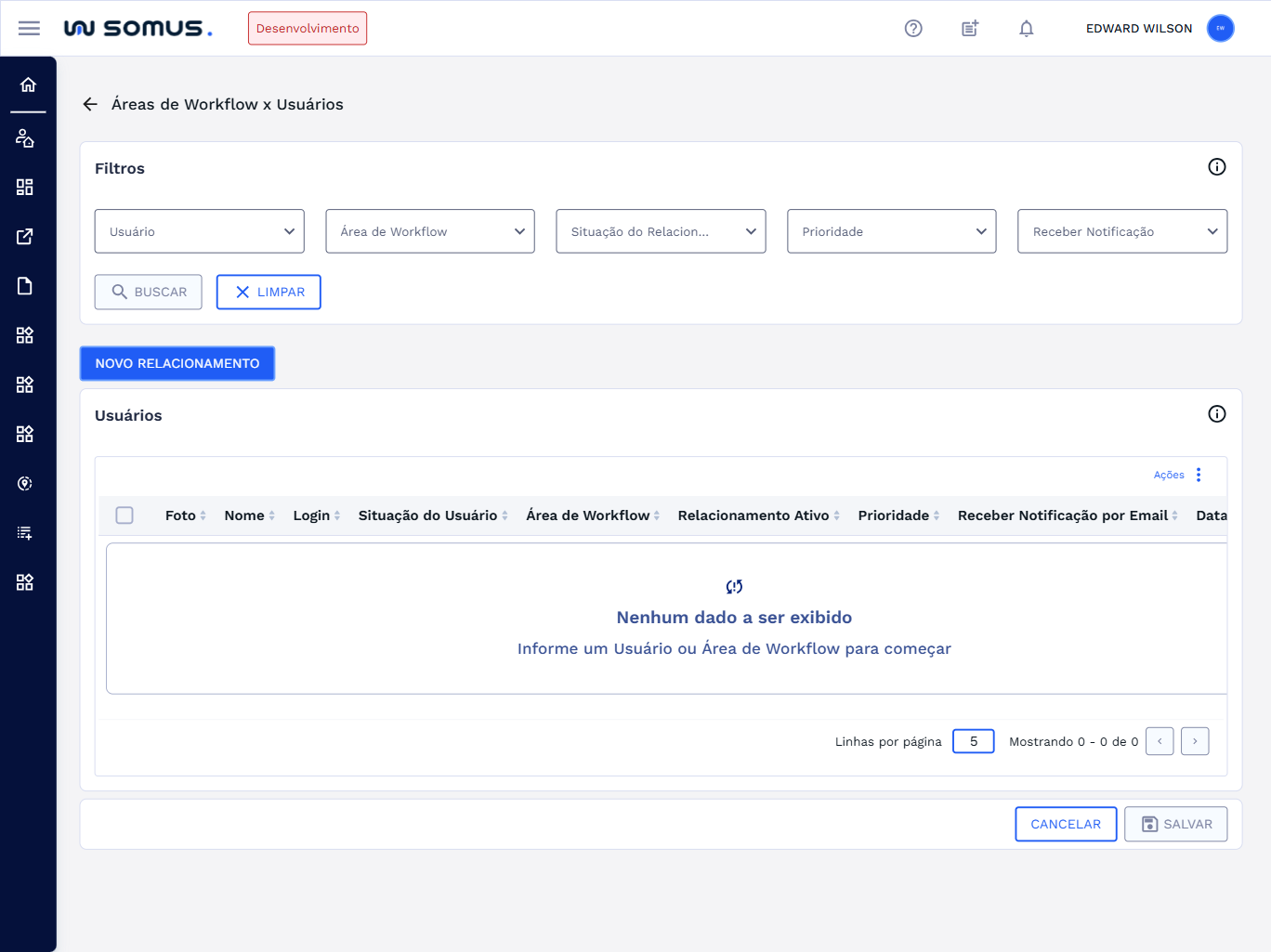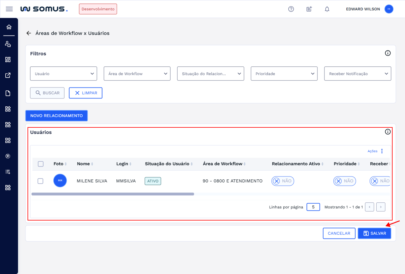 Principais ações que os usuários poderão executar ao acessar a funcionalidade de Relacionamento de Área de Workflow x Usuários