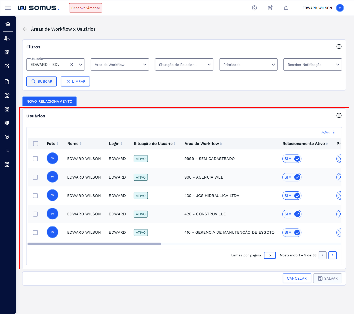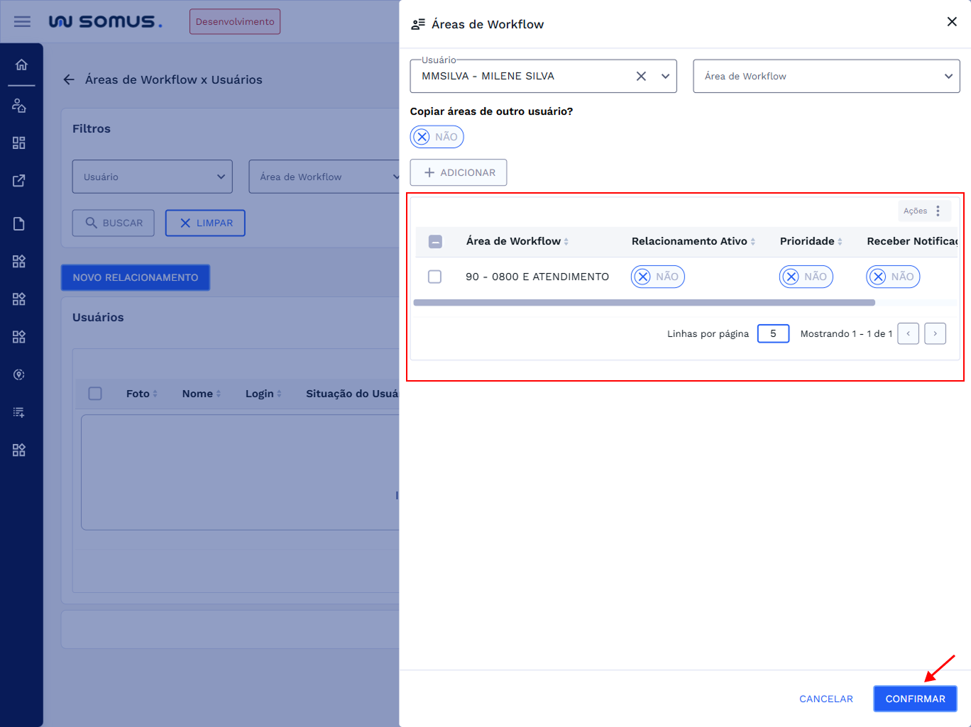 Após realizar a busca o sistema irá listar o usuário selecionado e todas a suas áreas de workflow relacionadas. Conforme a imagem abaixo: