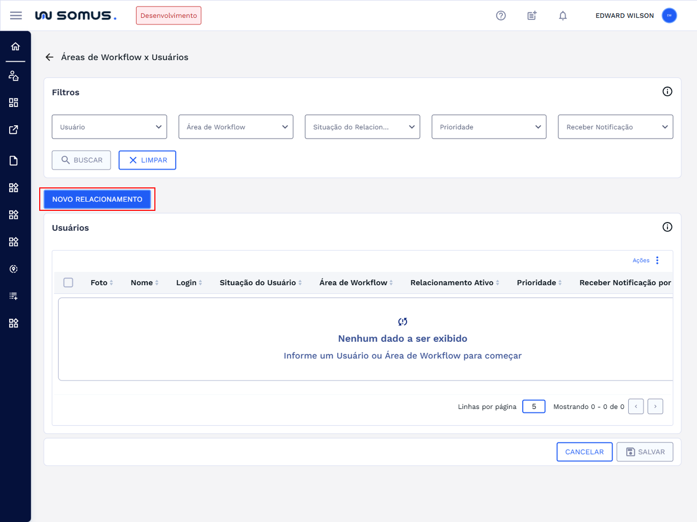 Para fazer um novo relacionamento de usuário com área de workflow, clique no botão “NOVO RELACIONAMENTO”, imagem abaixo: