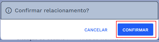 Após clicar em “SALVAR” será aberta uma janela de confirmação, clique em “CONFIRMAR” para continuar e salvar o relacionamento. Caso deseje retornar basta clicar em cancelar, o sistema retornará para a tela de relacionamentos.