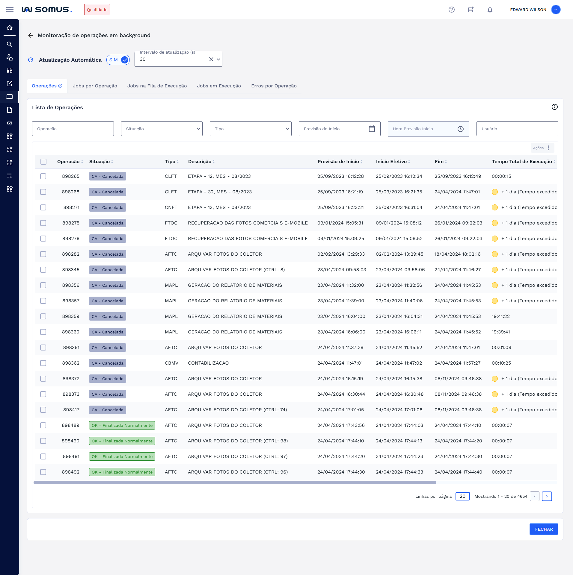 Essa funcionalidade foi pensada para garantir que os dados exibidos estejam sempre atualizados. Essas operações ficam disponíveis em formato de tabela, localizada na primeira aba de consulta, chamada Operações.