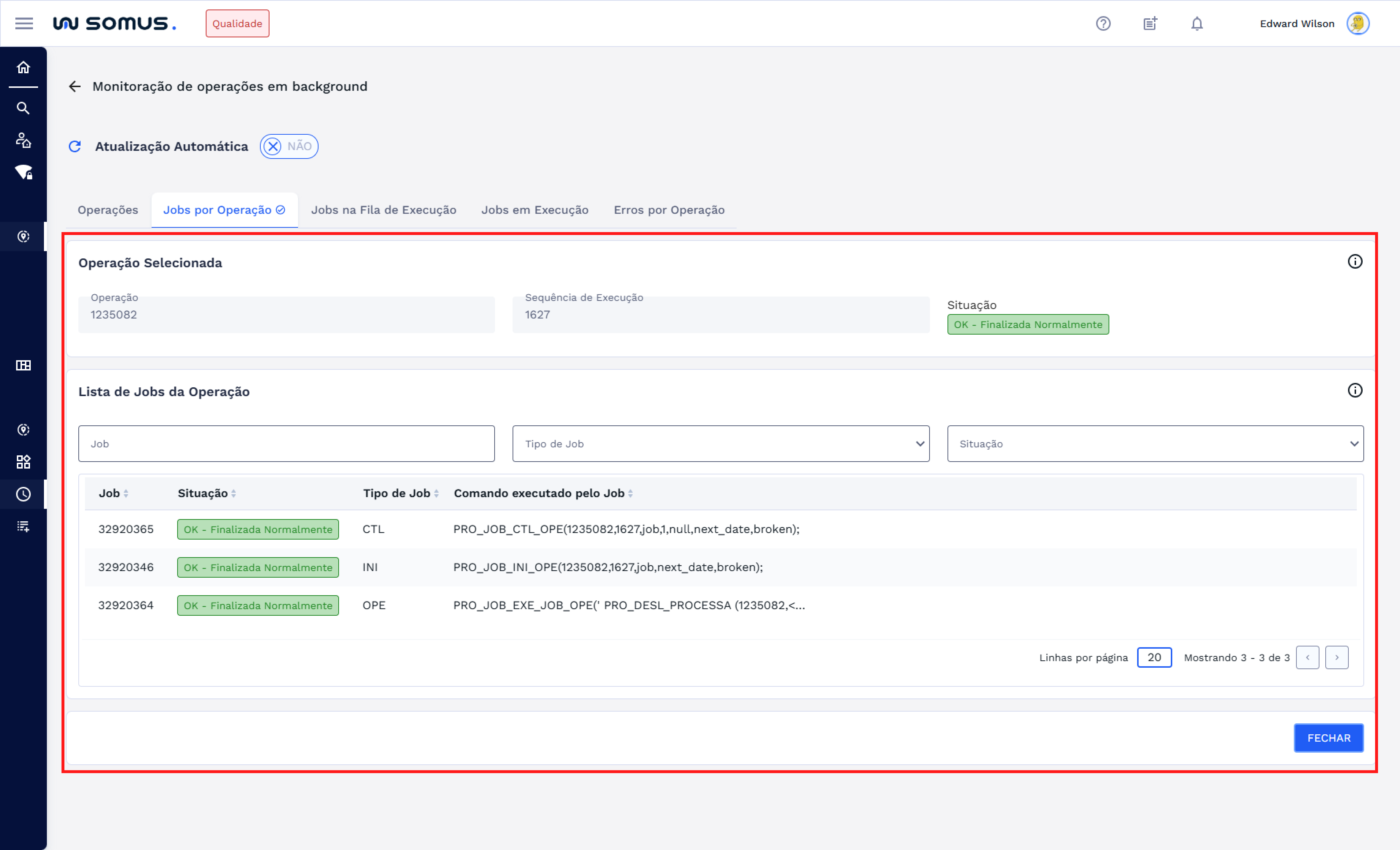 Nessa aba, os detalhes da operação escolhida estarão preenchidos automaticamente. Abaixo, será exibida a lista de jobs relacionados, com a possibilidade de aplicar filtros por job específico, tipo e situação, facilitando a busca e análise dos dados.