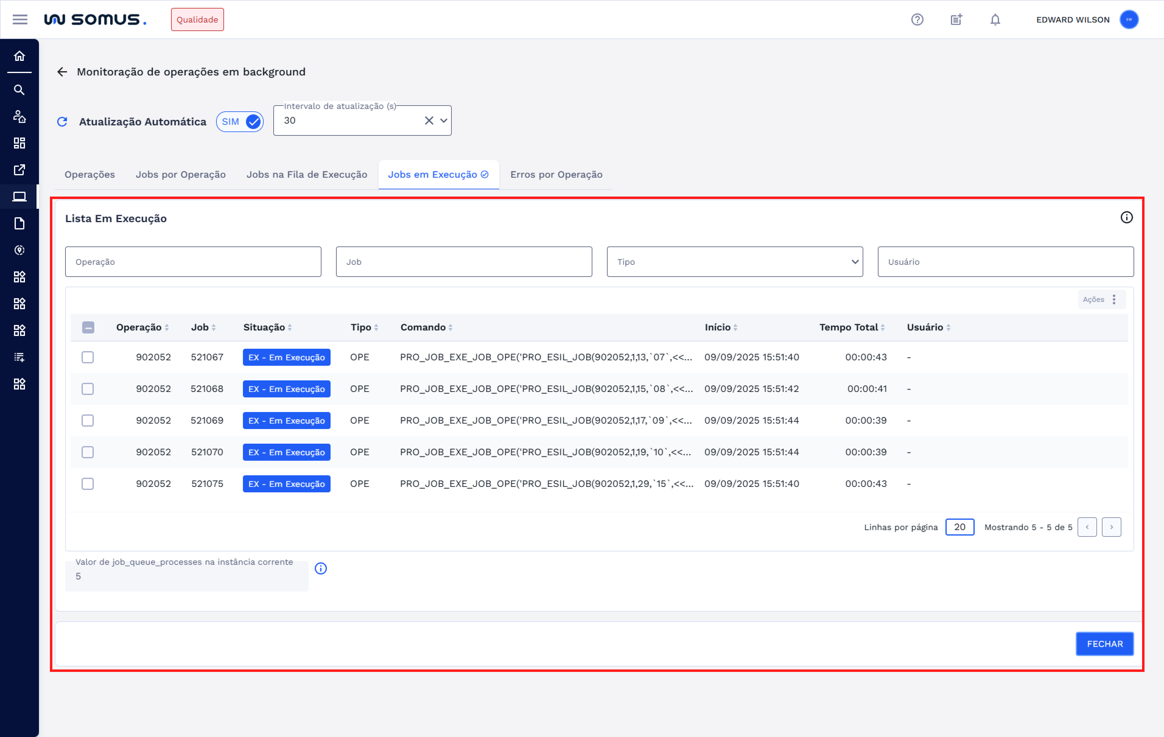 Na tabela, serão exibidos os jobs em execução com a possibilidade de aplicar filtros para facilitar a visualização, como: job específico, operação, tipo e usuário.