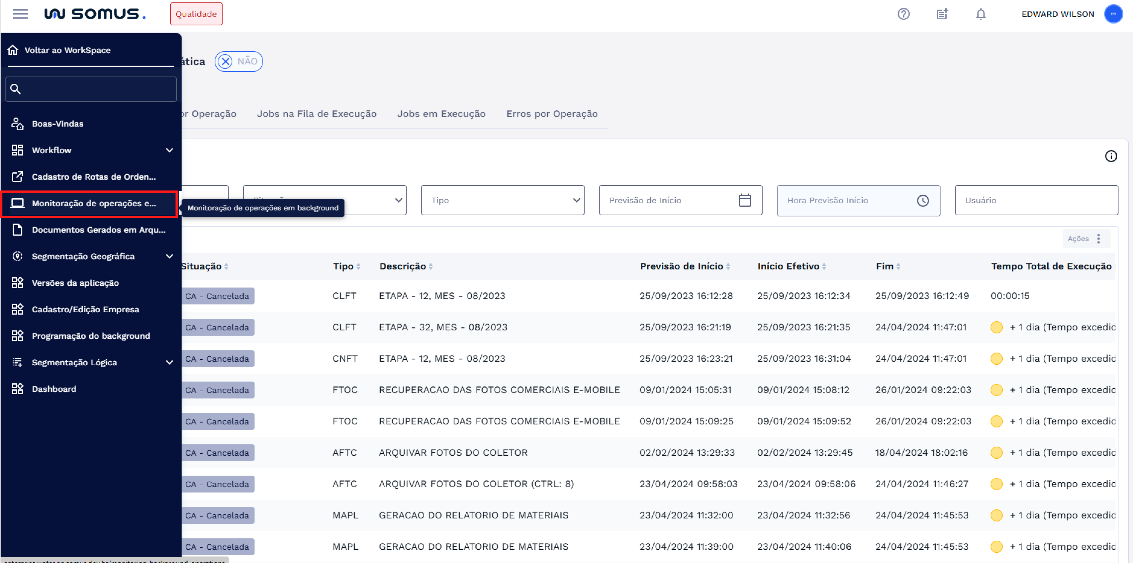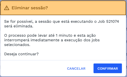 Será possível eliminar a sessão do usuário que criou a operação em segundo plano. Ao eliminar a sessão, todas as operações associadas a ela também serão encerradas, com exceção dos jobs do tipo CTL - Controle, que permanecerão ativos