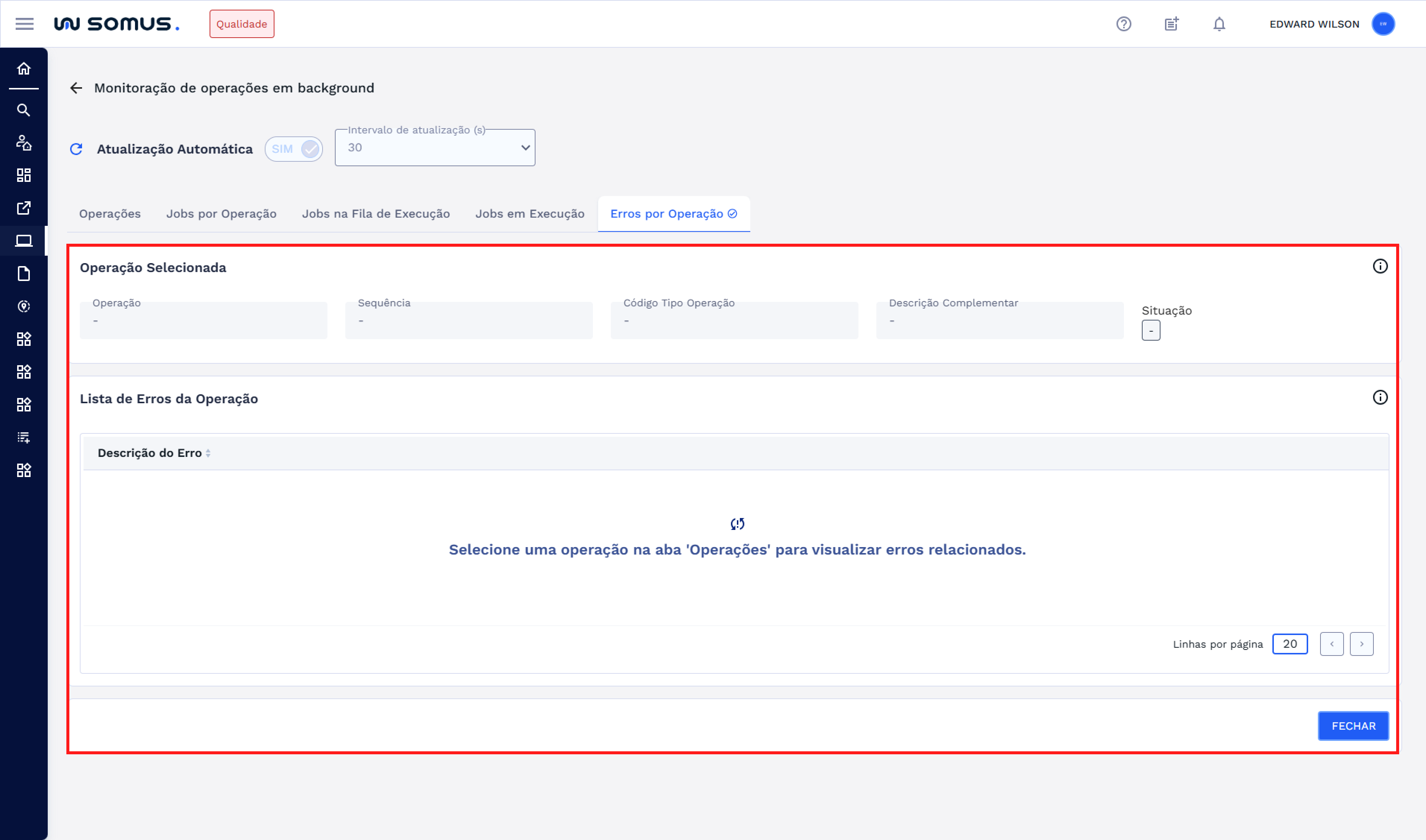 Para operações que já estão finalizadas, é possível excluir os erros. Para realizar a exclusão, é necessário desligar a atualização automática. Após isso, clique no botão EXCLUIR ERROS logo abaixo dos detalhes da operação selecionada.