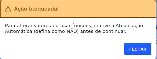 Para executar ações ou alterar valores, desative a atualização automática. Caso contrário, esta validação será exibida.
