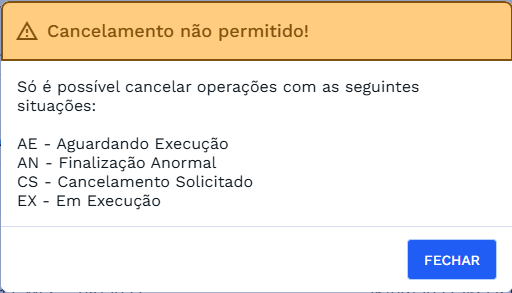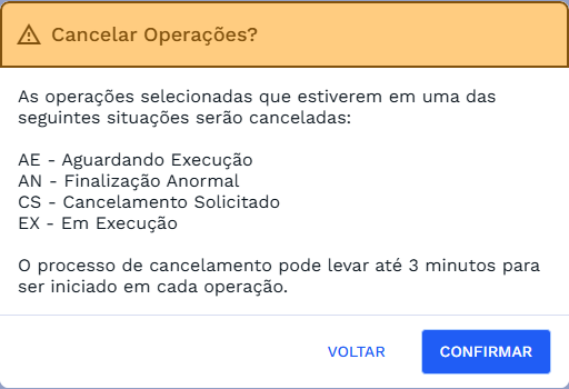 ⚠️ Importante: Mesmo ao selecionar todas as operações, somente aquelas que estiverem nas situações listadas acima serão efetivamente canceladas.