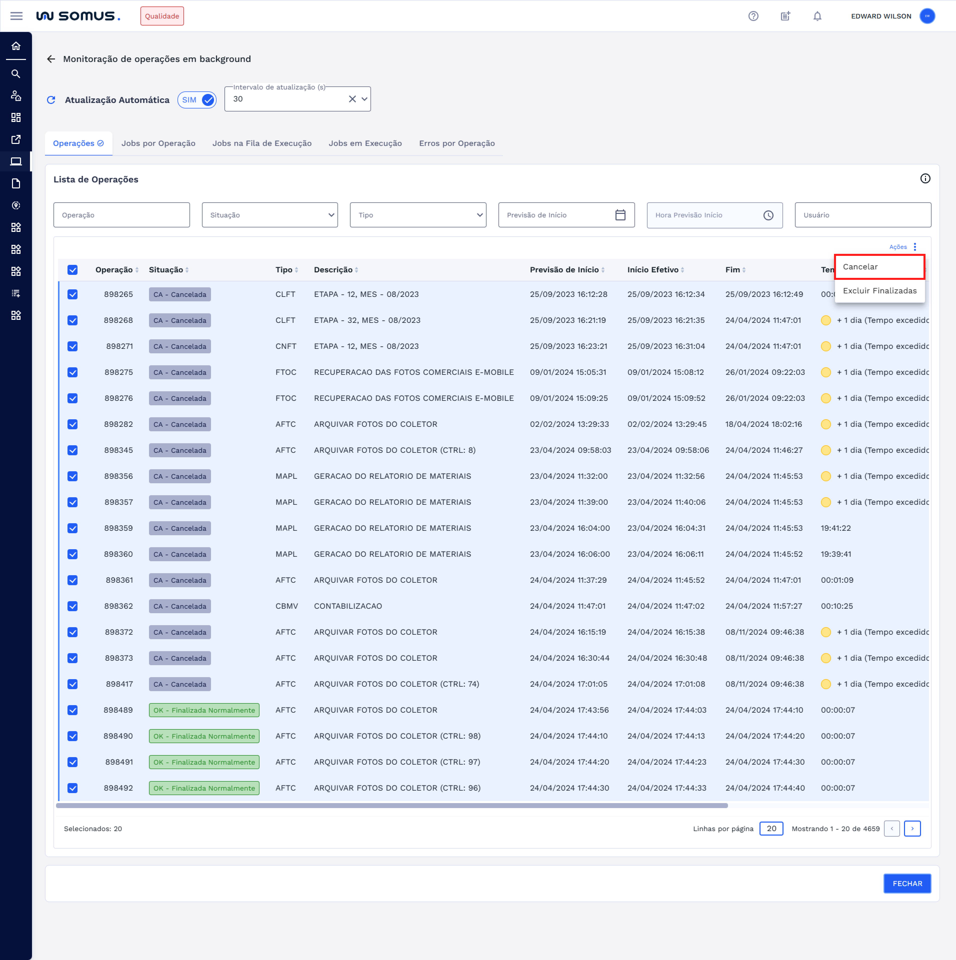 Para realizar a exclusão das operações, é necessário desligar a atualização automática. Após isso, selecione uma ou várias operações (ou utilize a opção "Selecionar tudo") e, em seguida, clique no botão "Ações" da tabela. Depois, escolha a opção EXCLUIR.