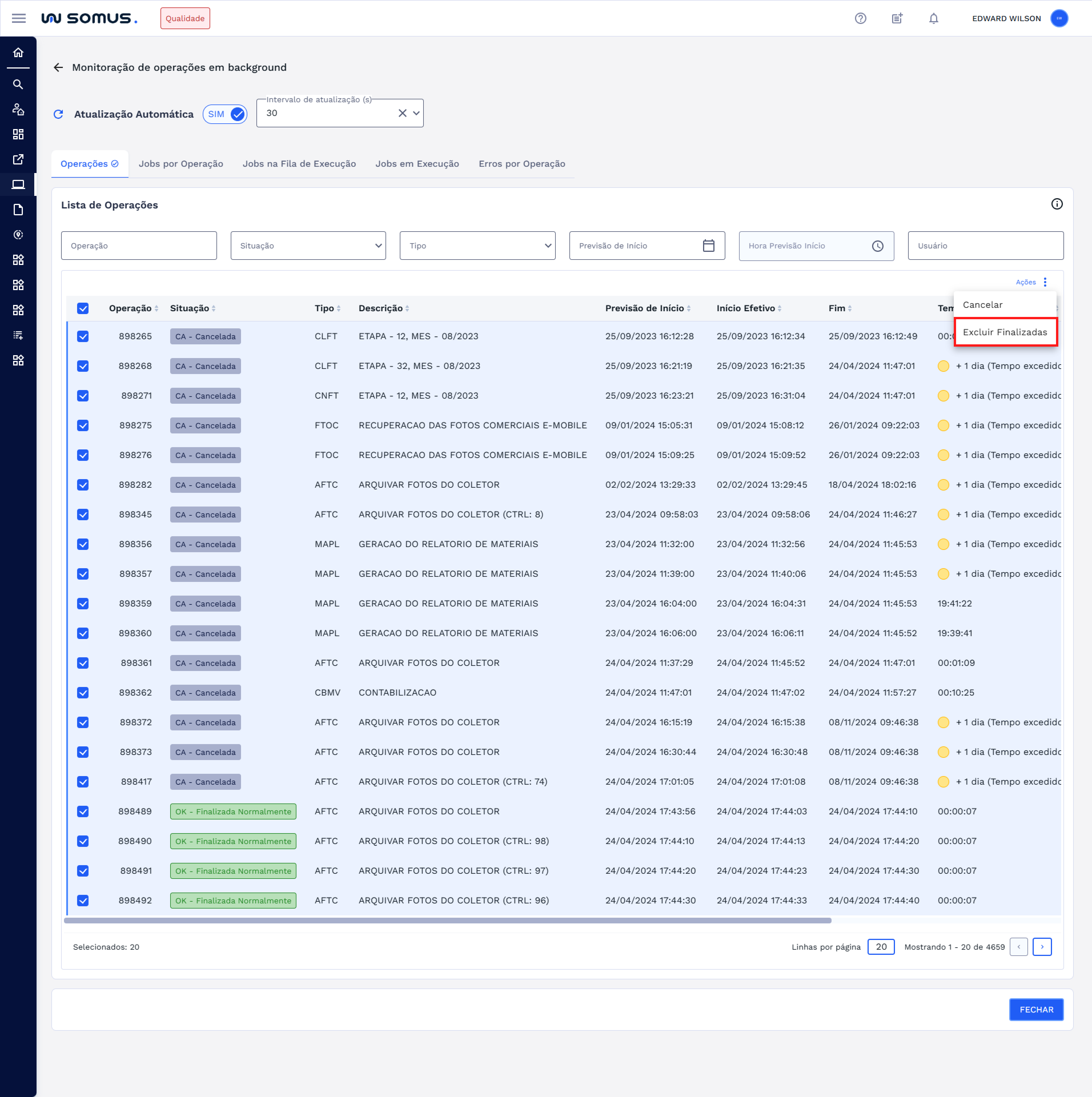 ⚠️ Importante: Mesmo ao selecionar todas as operações, somente aquelas que estiverem nas situações listadas acima serão efetivamente excluídas.